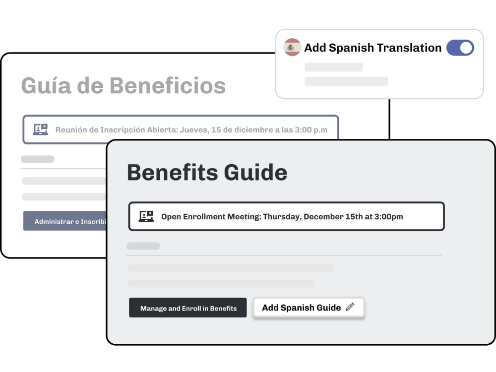 In order to solve the translation problem for benefits, we built a solution that is fluent in both Spanish translation and in benefits translation. With a click of a button, translate your entire suite of employee communications to Spanish. No extended wait times, no consulting fees.